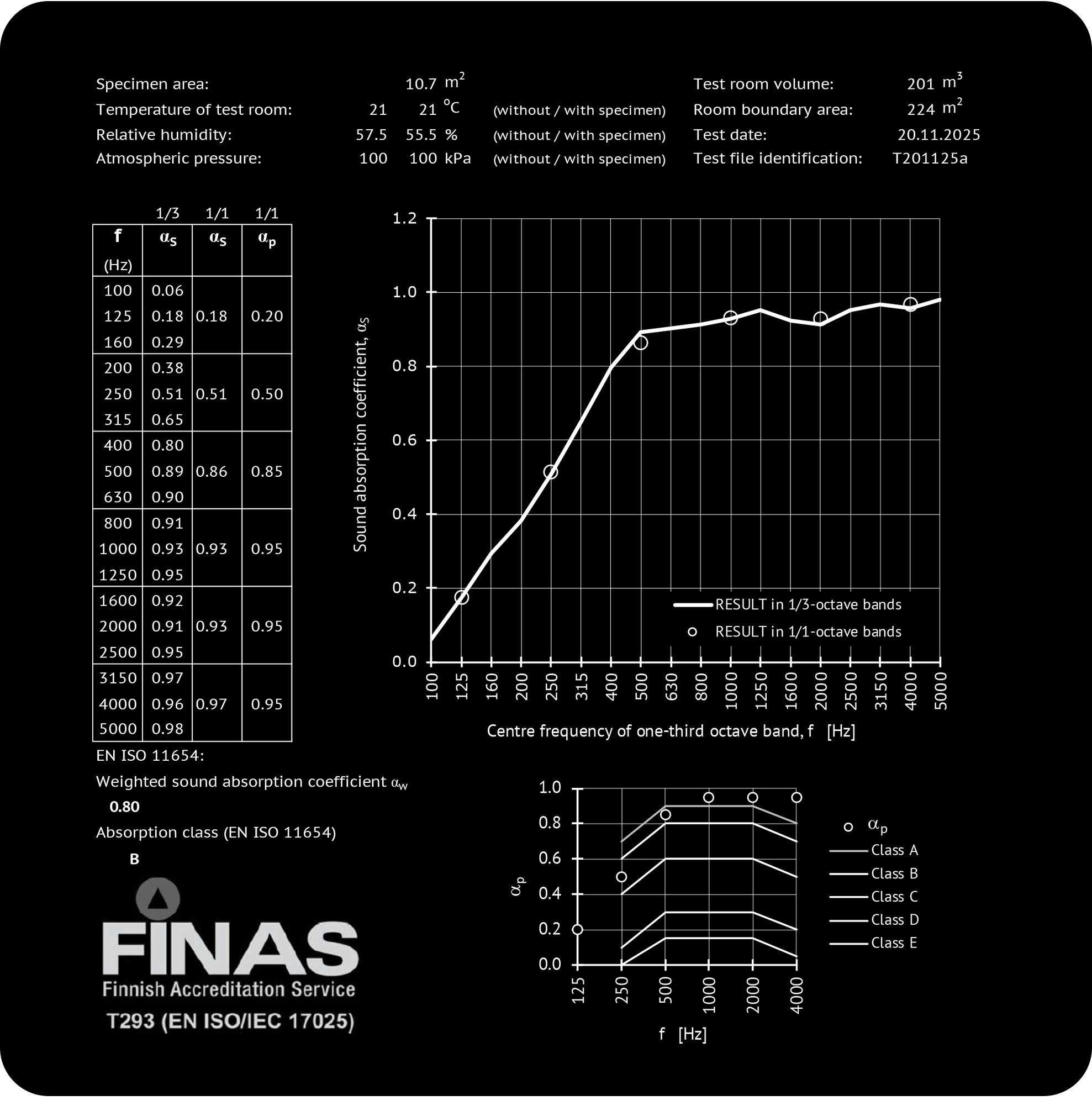 The panel was tested as installed directly against a surface (Type A mounting) with no air gap, mirroring real-life placement and ensuring that its performance remains honest and dependable in use.
